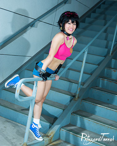 Construction Notes: I made the jacket and shorts from scratch, PVC is awful to work with so I couldn't add all the detail I wanted, but at least it's shiny! I opted to modify a camisole instead of wearing a tube top out of preference, as I dunno I think tube tops are kinda ugly haha. Plus I didn't want to worry about it sliding or shifting. I modified a pair of shoulder gloves for the glove and bracer, I made the belt, and the pink shades and Converse hi-tops were sourced online.