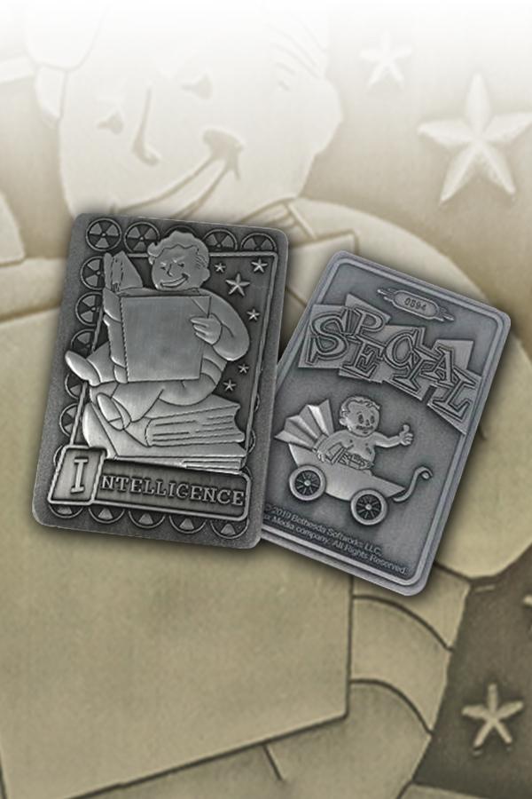 Here's #5 in the S.P.E.C.I.A.L. set: Intelligence! This is limited edition and numbered with 5,000 pieces available worldwide. Made out of zinc alloy with a distressed post-apocalyptic finish, embossed on both sides, and measures approximately 3" x 2". Please note that Bethesda Gear is the ONLY authorized US retailer for these metal cards. $30 and available for purchase now through Bethesda Gear.